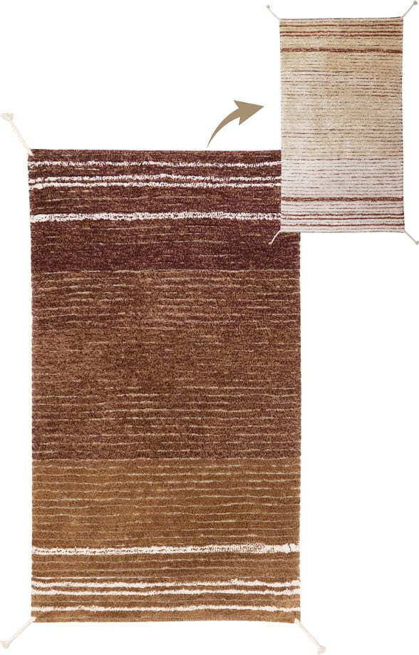 Tento koberec značky Lorena Canals vyniká proměnlivou barevnou paletou, která nabízí dva jedinečné styly v jednom produktu. Jedna strana zaujme hřejivými odstíny hnědé, zatímco druhá je laděna do přírodních tónů. Design na obou stranách doplňují kontrastní horizontální pruhy a ručně vyráběné šňůrky umístěné v rozích. Tento oboustranný koberec je praktickým a stylovým řešením pro váš interiér – jednoduše otočte a změňte nádech místnosti podle nálady.