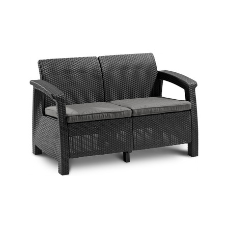 Moderní dvoumístná pohovka Corfu Love je všestranný kus nábytku na zahradu, velký balkon nebo terasu. Je vyroben z polypropylenu, který je velmi trvanlivý, odolný vůči povětrnostním vlivům a nevyžaduje žádnou údržbu. Na sedadlech jsou pohodlné polštáře se zipem v potahu. Pohovka je navržena pro snadnou montáž. Údržba: Doporučujeme čistit pouze jemnou houbičkou.