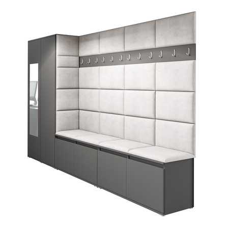 Předsíňová stěna AMI 9, je moderní a praktický prvek do vstupních prostor vašeho domu. Předsíňová stěna obsahuje dvacet pět čalouněných panelů, které se montují přímo na stěnu za pomoci lepidla. Potah botníku je tkanina TRINITY, která je měkká a příjemná na dotek. Jedná se o velurovou tkaninu. Předsíňová stěna se skládá z několika částí. Údržba: Vyhněte se použití chemikálií. Lepidlo není součástí balení.